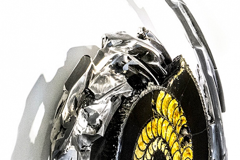 За основу панно взят аммонит, внутри которого за долгие века образовался жёлтый симбирцит. Древний минерал придаёт этому панно яркое, солнечное настроение. Художник вручную создал для раковины металлическое обрамление, которое продолжает её спиралевидную форму.