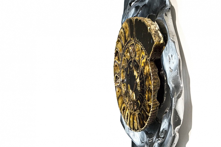 Эстетическая и коллекционная ценность аммонитов зависит от того, какой минерал образовался в камерах раковин за пролетевшие века. В это панно инкрустирован окаменелый моллюск, в камеры которого проник симбирцит.