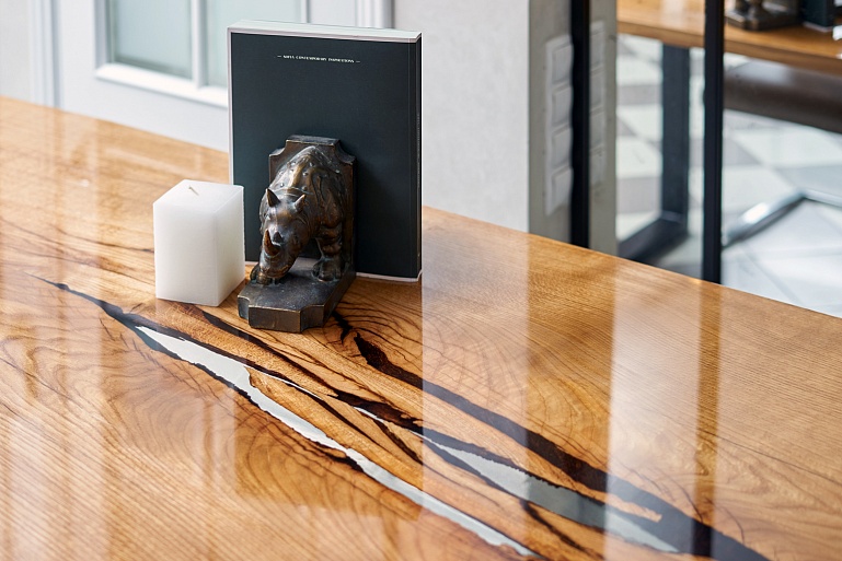 Главные особенности стола — глянцевый блеск лака и трещины в спиле дуба, запечатлённые в кристально чистой эпоксидной смоле.
