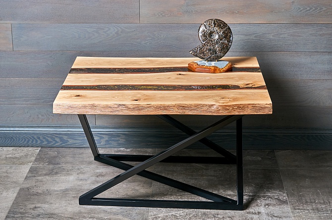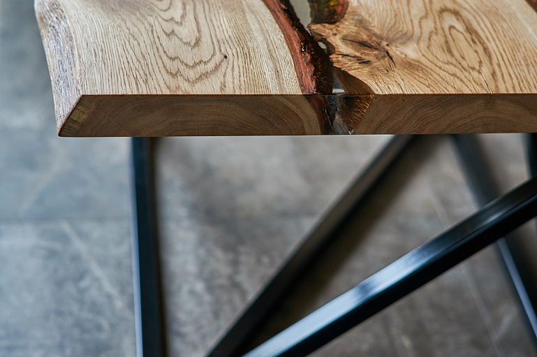 Три дубовых слэба надёжно скреплены эпоксидной смолой. После того, как мастер запечатлел в смоле тончайшие ворсинки, он отполировал поверхность изделия. С двух краёв мастер снял кору, но сохранил фактуру дерева под ней. Получившаяся столешница стала идеально ровной и цельной. В конце работы мастер пропитал её немецким маслом.