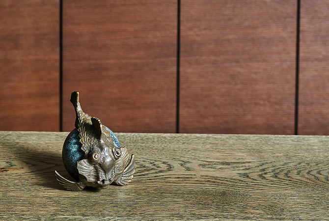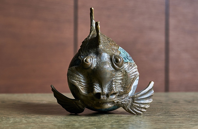 Bronze fish is handmade and surprises the observer by carefully made tiny details. The craftsman paid attention to every single flake on the back of this creature of the sea. Stone verde antique adds blue shades of metallic elements to the figurine. Its texture resembles the surface of the sea.